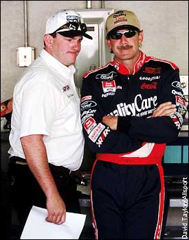 Dale Jarrett talks to Todd Parrott during the Brickyard 400.