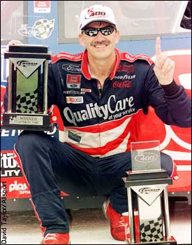 Dale Jarrett displays the trophy after winning the Kmart Michigan 400 at the Michigan Speedway in Brooklyn, Michigan.