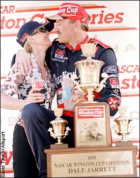 Dale Jarrett anticipates a kiss from his wife Kelly after clinching the NASCAR Winston Cup Champioship during the Pennzoil 400.