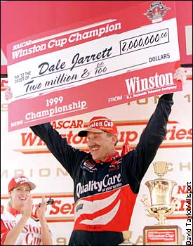 Dale Jarrett displays his prize check after clinching the NASCAR Winston Cup Champioship during the Pennzoil 400.