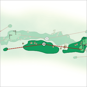 Beardies" to the left. Except for a very long drive, the second shot should be played onto the adjacent fifth fairway to avoid Hell bunker. Approach to a plateau green is difficult to hold because of the slope.