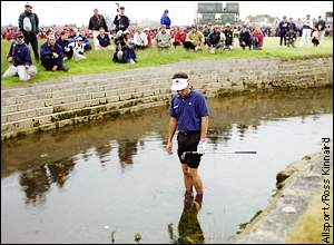 | Waterloo Jean Van de Velde looks at his ball in the burn on the 18th hole during the 1999 British Open at Carnoustie. Van de Velde took a three-shot lead to the 72nd hole only to make triple-bogey, then lose the title in a playoff.