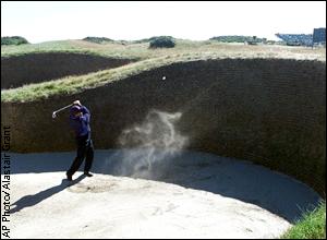 | Trapped! Michael Campbell plays out of a bunker on the 16th hole during Wednesday practice round.
