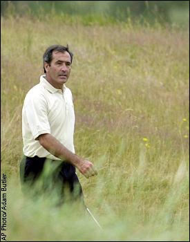 Seve Ballesteros strolls through the rough during practice for the British Open golf championship. Ballesteros is in search of his fourth British open title.