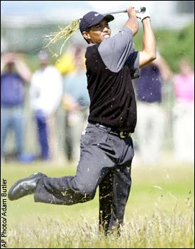 | Can he be tamed? Tiger Woods plays out of the rough on the 17th on the opening day of the British Open Golf championship on the Old Course at St. Andrews. Woods finished the day with a bogey-free round of 67.