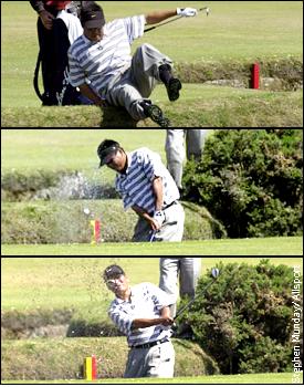 | Road block Notah Begay III climbs into the Swilken Burn on the 17th hole, then successful hits his ball out of the hazard. Begay would go on to triple-bogey the par-4 Road Hole.