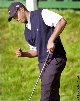 | Knockout punch? Tiger Woods celebrates after sinking a birdie putt on the 18th hole. Woods' 16-under-par has him in the tournament lead.