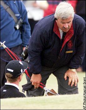 David Duval asks for a ruling from a Royal and Ancient official while in a bunker on the 17th hole. Duval made a quadruple bogey-8 on the hole.