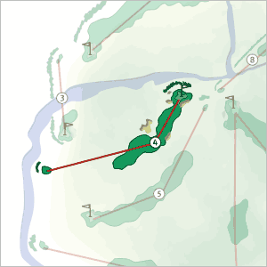 Short dogleg left that tempts players to carry a bunker 250 yards away down the left side. Two bunkers guard the left front of the green, a third bunker to the right. Floyd's Fork could come into play behind the green.
