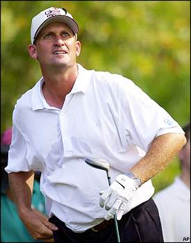 | Tied for second Chris Perry watches his shot from the 12th tee during second round play of The Tour Championship at East Lake Golf Club in Atlanta, Ga., Friday, Nov. 3, 2000. Perry finished the rund tied for second with Tiger Woods with a 6-under-par 134 for the tournament.