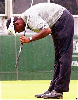 | Missed birdie Vijay Singh reacts to a missed birdie putt on 18 that would have put him in sole possession of the lead during third round play of The Tour Championship at East Lake Golf Club in Atlanta, Ga., Saturday, Nov. 4, 2000. Singh end the round tied with Tiger Woods with a 10-under-par for the tournament.