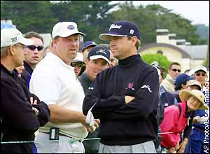 Davis Love III questions a spectator who yelled out "Mrs. Doubtfire" while playing partner Colin Montgomerie was hitting from the 18th fairway during the first round of the 100th U.S. Open Golf Championship.