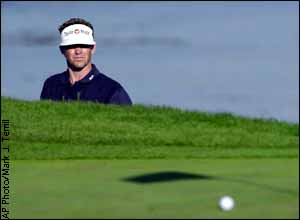 | Keep your eye on the ball Lee Janzen watches his ball after a bunker shot on the 18th hole during the third round of the 100th U.S. Open Golf Championship. Janzen stands at 10-over 223 after three rounds.