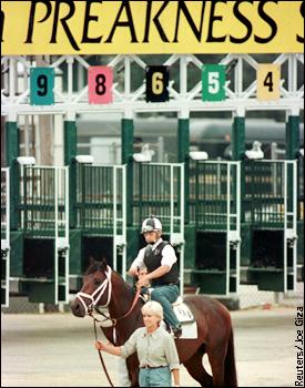 Preakness hopeful Impeachment with exercise rider Pablo Fragaoso, is led to the track at Pimlico by Ginny Depasquale. The horse, which finished third in the Kentucky Derby, is listed at 8-1 odds.