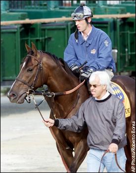 Trainer Bob Baffert leads Captain Steve, with exercise rider Peter Hutton out to the track at Pimlico for a workout. | ||||||