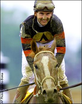 Jockey Jerry Bailey smiles as he rides Red Bullet to the winner's circle after winning the 125th Preakness Stakes. | ||||||
