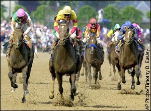 Jockey Kent Desormeaux rides Fusaichi Pegasus, second from left, to the finish just ahead of Aptitude, left, ridden by Alex Solis during the 126th running of the Kentucky Derby.