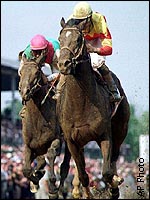 Frozen solid on the Churchill Downs track or not, the mighty Fusaichi Pegasus made his opponents look like imposters while striding furiously down the frontstretch to win the 126th running of the Kentucky Derby on a glorious Saturday afternoon. "This pretty boy can run," said jockey Kent Desormeaux, who stood in the winner's circle before with Real Quiet in 1998. "I've been around a long time and he's the best horse I've been with at this stage of the game." On his 10th mount at the Derby, Desormeaux deserves some credit as well, because the race wasn't exactly a foregone conclusion. In fact, Fusaichi Pegasus didn't show what he's fully made of until the final turn after stalking the field from the inside rail for the majority of the race. As the horses approached the final turn, Desormeaux experienced an instant of concern due to the traffic in front of the freakish bay colt. Ironically, trainer Neil Drysdale's other entry, War Chant, was to his inside keeping him locked in. Seconds later, something magical would happen. Something that, to a jockey, can only be compared to something like the moment when the rain gives way to sunshine for a Little Leaguer or when a stockbroker's longshot IPO gains sudden momentum during a Bear market. The pack of colts subsided, leaving a clear path for the 2-1 shot to make his move to glory to become the first favorite to win since Spectacular Bid in 1979. "The racing Gods smiled on us," said Drysdale. "He's a very talented horse. He's got natural speed." That's an understatement. There's speed, and then there's explosion. That's exactly what Fusaichi Pegasus did when he bounced to the outside of Wheelaway at the beginning of the stretch run. "I got him in the clear and I kissed at him and asked him to run and he accelerated," said Desormeaux, explaining what signal the horse received when daylight opened. Kissed, huh? Well, his Triple Crown hopeful acted as though he was a 16-year-old boy who'd been kissed by Ashley Judd. "He just took off like a rocket and the race was over," said Desormeaux, who only hand-patted his colt on the top of the neck to urge him to a 2:01.12 finish -- tied for sixth best in history. "I had tons of horse. Neil had him trained right to the minute today." A hard-changing Aptitude gave an inspired performance to finish 1 ½ lengths behind for second place, but jockey Alex Solis admitted that a miracle would have had to have taken place to catch the winner. "The winner was in front of me all the way and I was trying to reach him," said Solis, who finished in second for the third time and placed for the fifth time in the Derby. "But he was running so easy. He obviously is a very special horse." The Todd Pletcher-trained More Than Ready was also one of the colts left with chunks of dust the size of Japan in his eyes. "I thought I was going to win it. Then the winner went by me and I knew I couldn't catch him," said jockey John Velazquez on his fourth-place finish. Said 64-year-old owner Fusao Sekiguchi, who raised many an eyebrow when he purchased the son of Mr. Prospector for $4 million in 1998, through an interpreter, "As soon as he turned the fourth turn, I knew he would burst out. I knew he would win. "When I laid eyes on the colt, I knew he was a Derby winner. I would have paid $5 million to acquire him." Fusaichi Pegasus, who became the first Derby winner to not win as a two-year-old since 1965, was surprisingly calm as he made his way to the track around 5 p.m. ET. Pegged as a wild child for his eccentric habits when given an audience, the Howard Stern of race horses looked more like Beaver Cleaver. He even stopped twice on the way to the paddock to relieve himself. That's relaxed. It's almost as if he was telling something to his competitors and what he thought of them. Yet, no matter how large the bull's eye that continues to grow becomes, there may not be a mammal alive that can chase down this seven-figure behemoth in the open track. We'll find out in two short weeks on May 20 in the Preakness Stakes at the Pimlico Race Course in Baltimore. He will undoubtedly be highly favored to become the fourth horse in a row to win the first two jewels of the Triple Crown. Who knows, maybe we'll finally get to see the first Triple Crown winner since Affirmed electrified the sports world in 1978. Why not, says Desormeaux, who is getting along with his horse so well he claimed, "I think we've become one. "With a little luck and good health, he's a horse that can do it." |