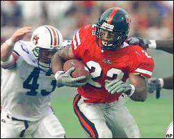| Mississippi running back Deuce McAllister (22) runs past Auburn defender Alex Lincoln (43) during a Sept. 9 game won by Auburn, 35-27. |