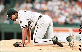 |  | | Chicago pitcher James Baldwin tries to recover after being hit in the leg on a shot from Texas' Mike Lamb. Baldwin remained in the game. |