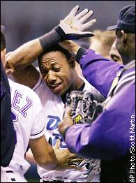 |  | | Gerald Williams gets swarmed by his teammates after spoiling Bob Wickman's debut with Cleveland.