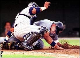 |  | | David Segui is thrown out at the plate by Mo Vaughn as Angels catcher Bengie Molina applies the tag in the third inning. Segui also was thrown out in the first. |