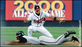 |  | | The Reds' Alex Ochoa is safe at second with a second-inning double, one of only three hits off Tom Glavine. |