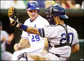 |  | | Jorge Posada shows he has the ball after tagging out the Royals' Mike Sweeney at home in the first inning. |