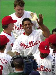 |  | | Bobby Abreu is congratulated after completing quite a day (see below) at the Vet in Philly. |