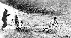 |  | | Mickey Owen scrambles to retrieve the infamous missed strike three in Game 4 of the 1941 Series. | The Yankees' Tommy Henrich swings and misses at Hugh Casey's 3-2 pitch with two outs in the ninth. But instead of the game being over, Henrich reaches first base when catcher Mickey Owen fails to corral the third strike.
