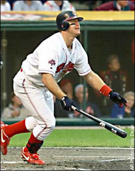 | | See Ya! Cleveland Indians batter Jim Thome slugs a grand slam off Boston Red Sox reliever John Wasdin in the fourth inning of the Indians 11-1 win in Game 2 of A L Division Series in Cleveland. At 2-0 the Indians are one win away from advancing to the League Championship Series.