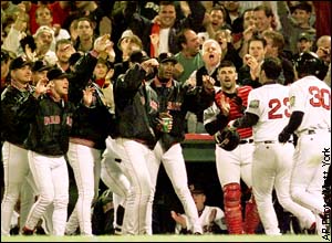 Boston Red Sox batter Brian Daubach, second from right, is greeted by his teammates after he hit a three-run homer against the Cleveland Indians during the 7th inning of Game 3 of their American League Division Series.