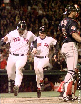 Jason Varitek, left and Darren Lewis, center score on a Trot Nixon double as Cleveland Indians catcher Sandy Alomar stands by the plate.