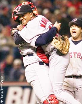 Catcher Jason Varitek hoists Boston Red Sox pitcher Pedro Martinez in the air as third baseman John Valentin joins the celebration after beating the Cleveland Indians 12-8 to win the AL Division Series in Cleveland.