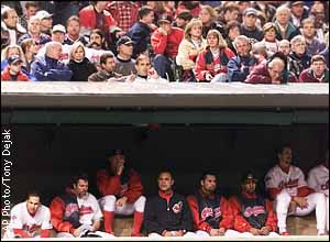 | | Still in Shock The Cleveland Indians sit quietly in their dugout mirroring their fans as they find themselves losing 12-8 in the eighth inning to the Boston Red Sox Monday, Oct. 11, 1999 in Cleveland. Behind five innings of shutout relief by Pedro Martinez, the Red Sox win to advance to the American League Championship Series against the New York Yankees.