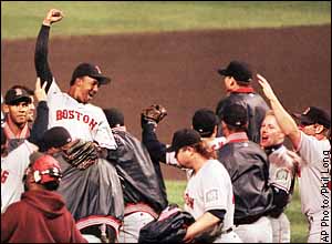 Pitcher Pedro Martinez is carried off the field by his teammates after they beat the Cleveland Indians 12-8 to win their AL Division Series in Cleveland.