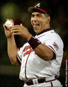 | | The Big Cat Atlanta Braves Andres Galarraga laughs as he throws out the first pitch for Game 1 of the National League Championship Series between the Atlanta Braves and the New York Mets in Atlanta Tuesday, Oct. 12, 1999. Galarraga is recovering from cancer but has been in the dugout since he has returned in uniform.