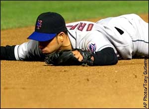 | | The one that got away New York Mets shortstop Rey Ordonez stretches out in the dirt after missing an Atlanta Braves' Walt Weiss hit in the eighth inning of Game 1 of the National League Championship Series in Atlanta Tuesday, Oct. 12, 1999. The Braves won 4-2.