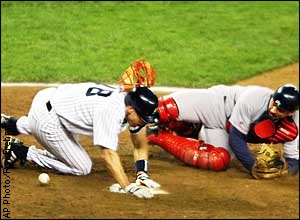 Boston catcher Jason Varitek, right, watches as Scott Brosius tags home after a collision during the seventh inning of Game 1 of the American League Championship Series.