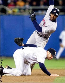 Jose Offerman comes up safe at second with a stolen base as New York second baseman Chuck Knoblauch reacts after the late tag during the fifth inning of Game 2 of the American League Championship Series.