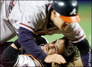 | | Up close and personal Atlanta Braves Bret Boone barrels over New York Mets catcher Mike Piazza at home plate for a double play to end the top of the first inning of Game 3 of the NL Championship Series Friday, Oct. 15, 1999, in New York. Piazza tagged Boone out on a throw from Mets center fielder Melvin Mora.