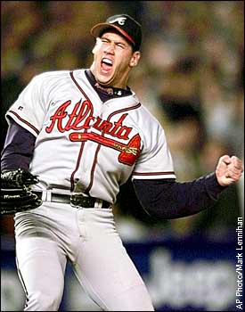 Atlanta Braves relief pitcher John Rocker celebrates at the end of the Braves' 1-0 win over the New York Mets in Game 3 of the NL Championship Series Friday, Oct. 15, 1999, in New York. The Braves lead the best-of-seven series 3-0.