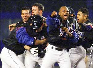 | | The Mets Gang New York Mets' Robin Ventura (3rdL-Bottom) is mobbed by teammates (2ndL-R) Rey Ordonez, Todd Pratt, Darryl Hamilton and Benny Agbayani after Ventura drove in the winning run in the 15th inning in Game 5 of the NLCS October 17. New York defeated Atlanta 4-3.