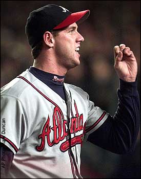 Atlanta Braves pitcher John Rocker reacts to New York Mets fans after the bottom of the eigth inning in Game 4 of the NL Championship Series Saturday, Oct. 16, 1999, in New York.