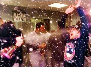 New York Yankees Chuck Knoblauch is sprayed with champagne in the locker room following their 6-1 win over the Boston Red Sox in Game 5 of the A L Championship Series, at Fenway Park in Boston.