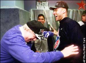 | | George Steinbrenner and Derek Jeter celebrate New York Yankees Derek Jeter, right, laughs as team owner George Steinbrenner bends over to look for his World Series ring after losing it during a locker room celebration after beating the Boston Red Sox 6-1 in Game 5 of the American League Championship Series Monday, Oct. 18, 1999 at Fenway Park in Boston.