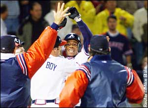 | | The Run that turned their World around Braves' Gerald Williams celebrates with teammates and the Braves bat boy after scoring the winning run in Game 6 of the NLCS October 19. Williams scored when Andruw Jones was walked with the bases loaded. Atlanta defeated the New York Mets 10-9 to advance to the World Series.