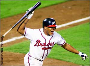 | | Walk into The World Series Braves' Andruw Jones celebrates as he runs to first base after drawing a bases-loaded walk to drive in the game-winning run in the 11th inning in Game 6 of the NLCS October 19. Atlanta defeated the New York Mets 10-9 to win the National League championship.