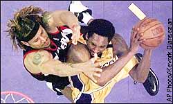 Despite defense like this by Brian Grant, Kobe Bryant managed 13 points in Game 1.