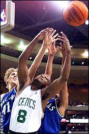 |  | | The Mavs' Dirk Nowitzki (41) knocks a rebound away from Boston's Antoine Walker. | "That young man in the corner has maybe the best stroke I've